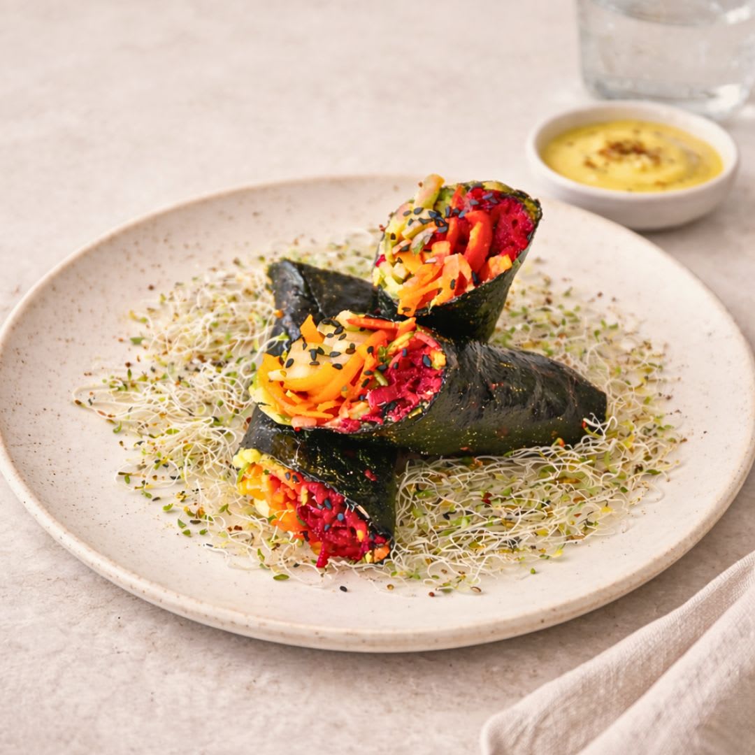 1. Este wrap com alga nori, vegetais crus e curry é inspirado em sabores leves e aromáticos da culinária asiática, perfeito para quem busca pratos naturais com referências japonesas e indianas.