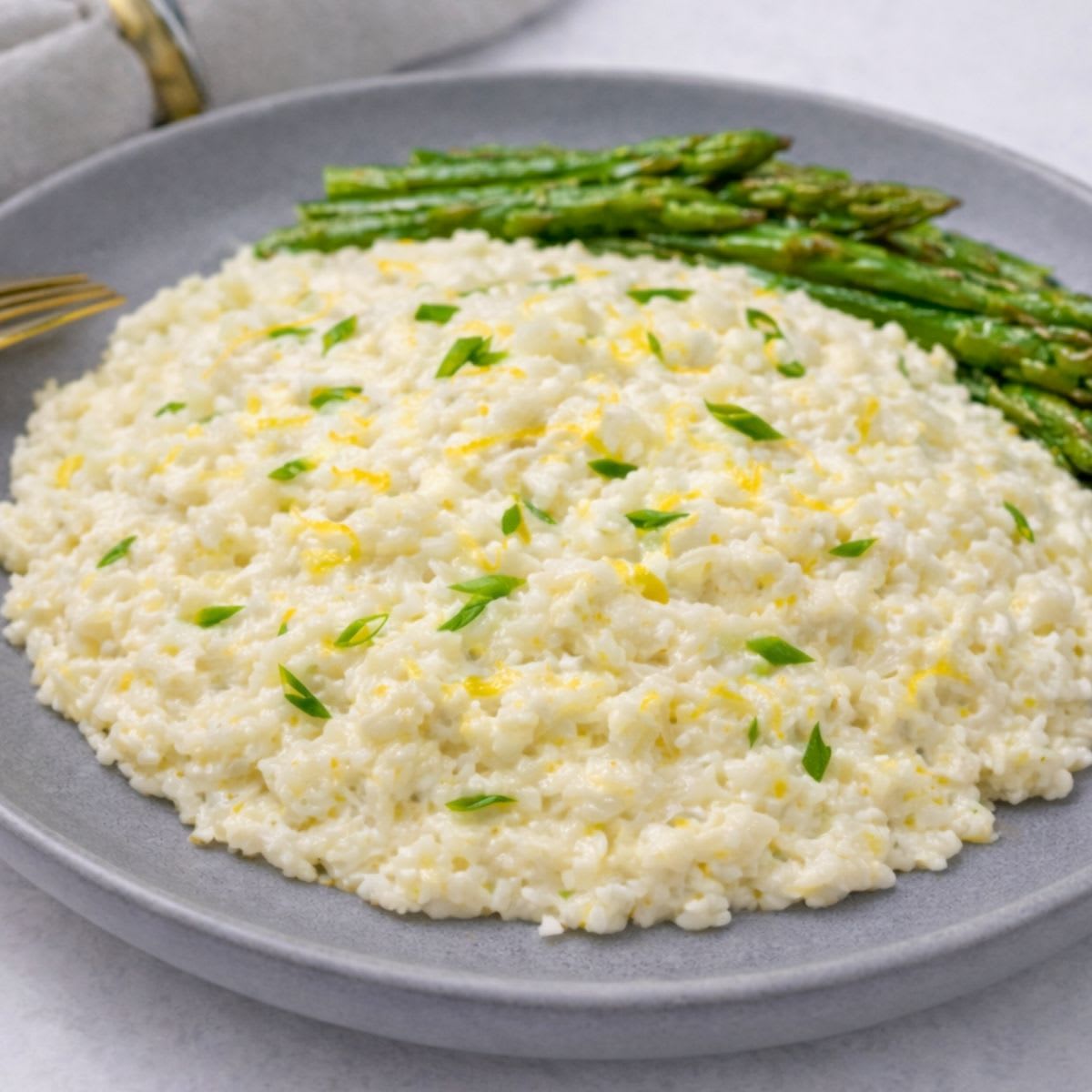 Arroz de couve-flor cremoso low carb, com limão e textura tipo risoto, leve, fácil e perfeito para substituir o arroz tradicional.