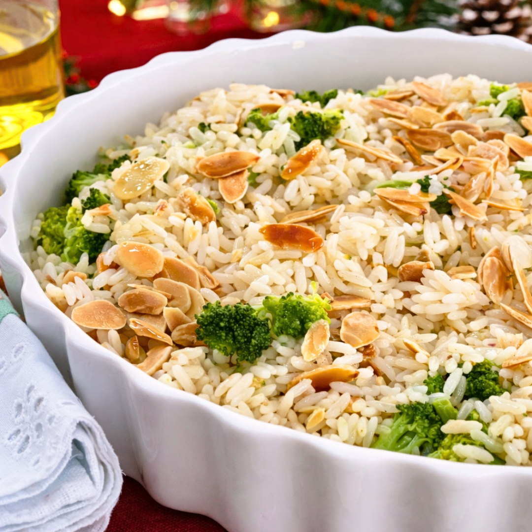 Arroz natalino com brócolis e amêndoas: leve, elegante e saboroso, perfeito para acompanhar pratos da ceia festiva..