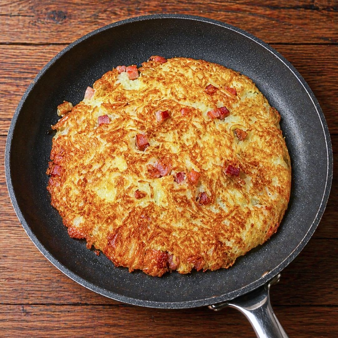 Batata de frigideira com queijo e bacon, inspirada na receita rosti, feita com poucos ingredientes e pronta em minutos.