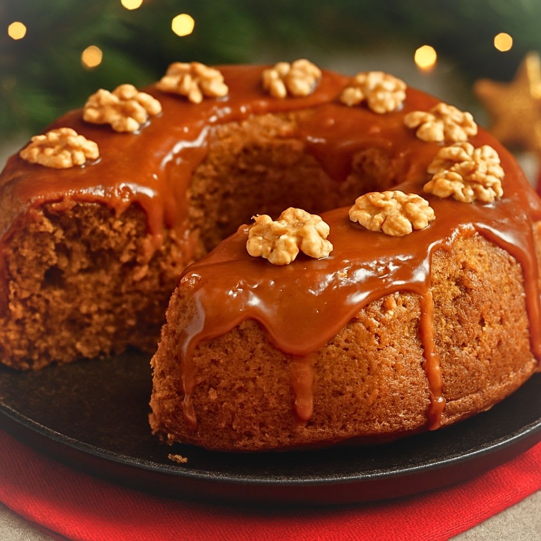 Bolo de Natal com cenoura, nozes e especiarias. Fácil e feito no liquidificador, com cobertura de caramelo salgado.
