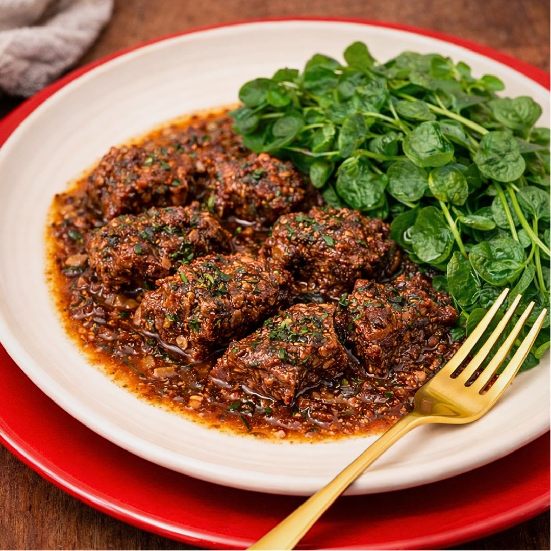 Carne de panela na pressão com molho encorpado, macia, suculenta e finalizada com agrião fresco.