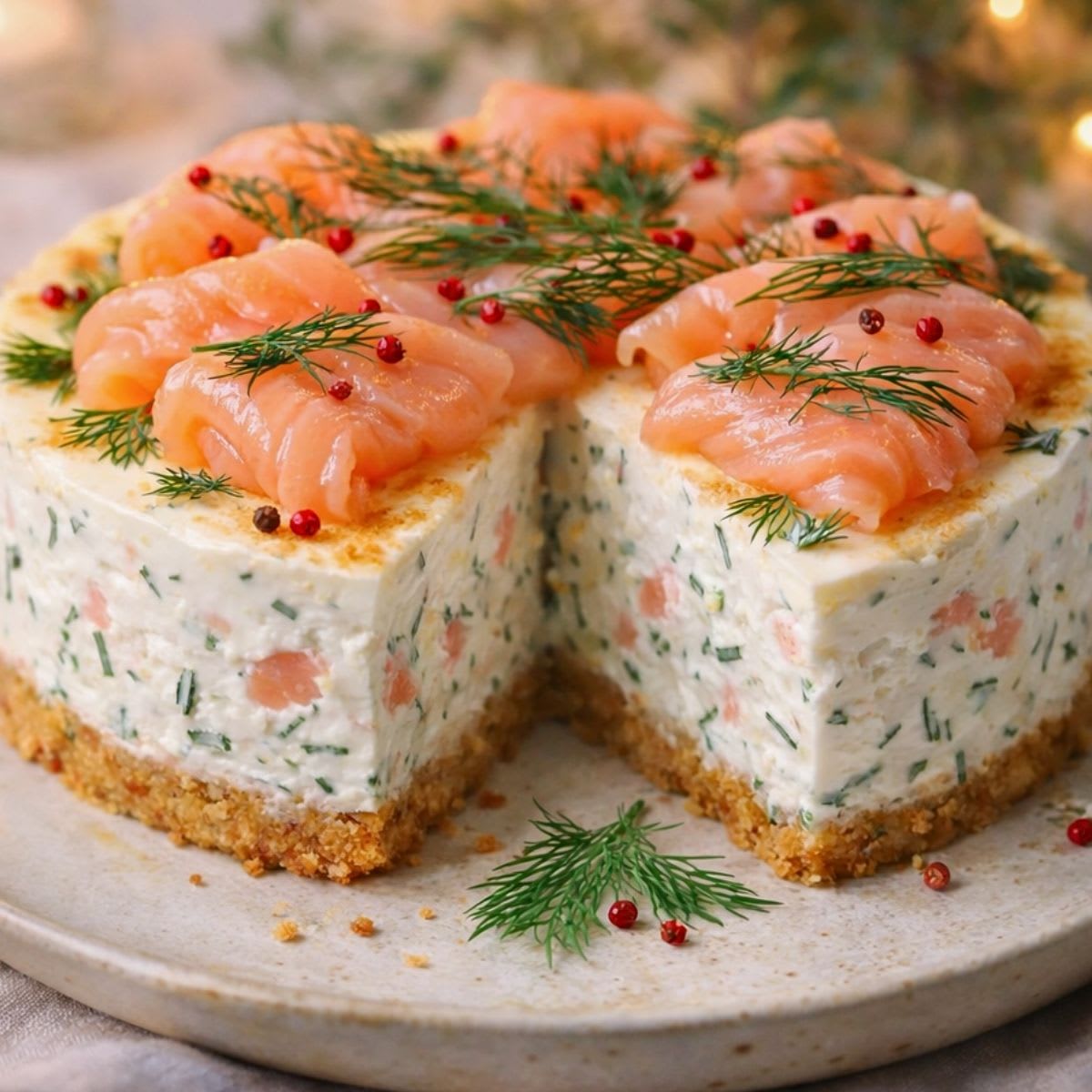 Cheesecake salgado de salmão com dill e base crocante — fácil, cremoso e sofisticado.