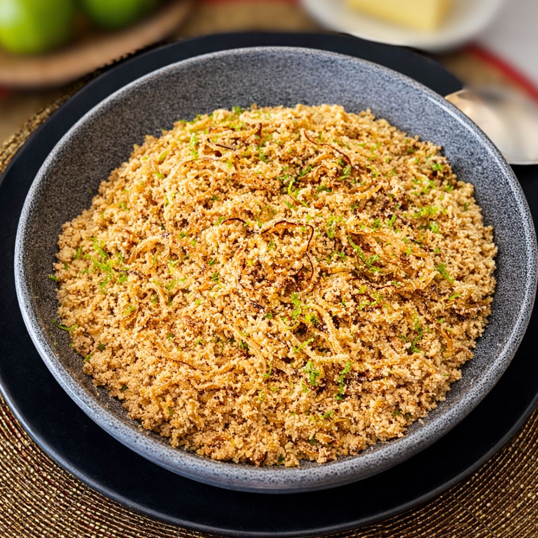 Farofa sem glúten com limão e cebola caramelizada: crocante e cheia de sabor para churrasco e pratos favoritos