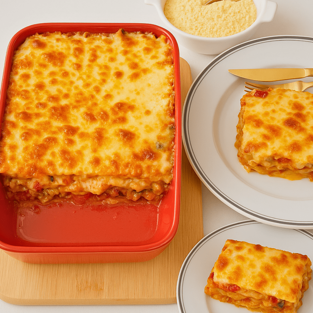 Uma lasanha vegetariana com bolonhesa de berinjela, sem carne, perfeita para surpreender com sabor e leveza