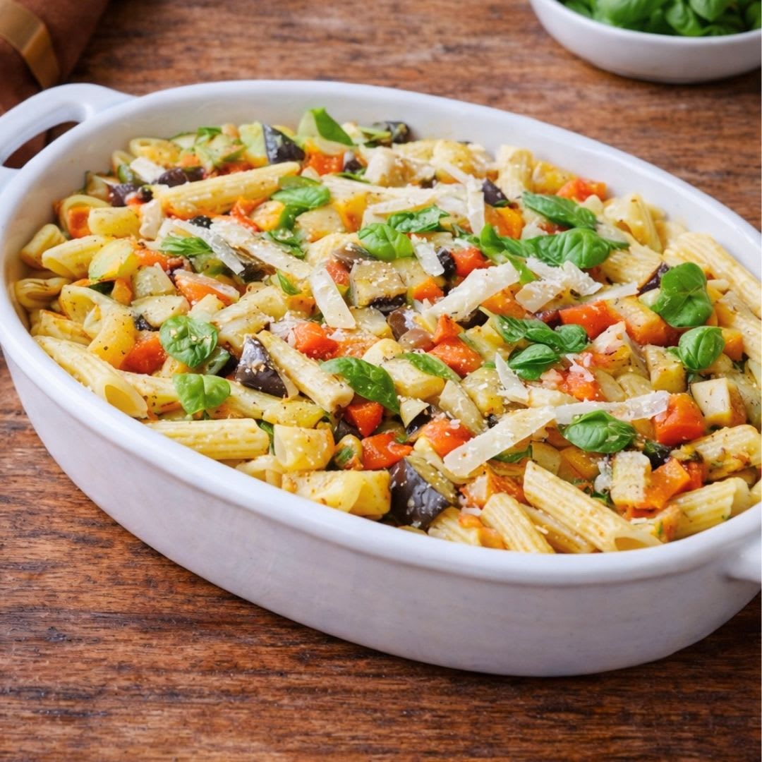 1. Arrume o macarrão com legumes à mediterrânea em uma travessa ou distribua nos pratos.