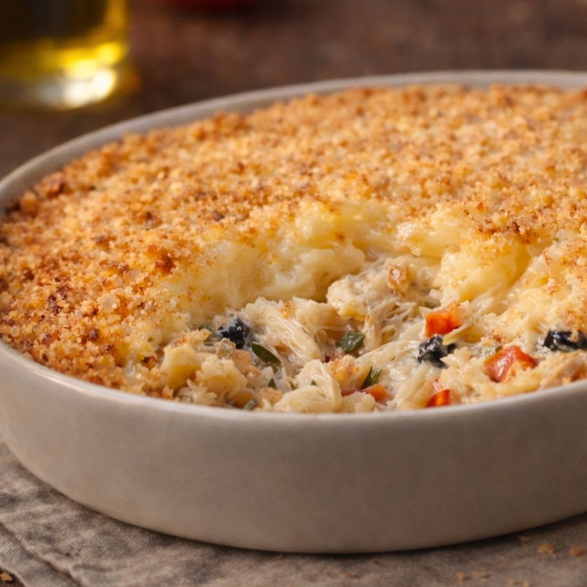 Escondidinho de bacalhau cremoso e gratinado, fácil de preparar, com recheio suculento e cobertura dourada.