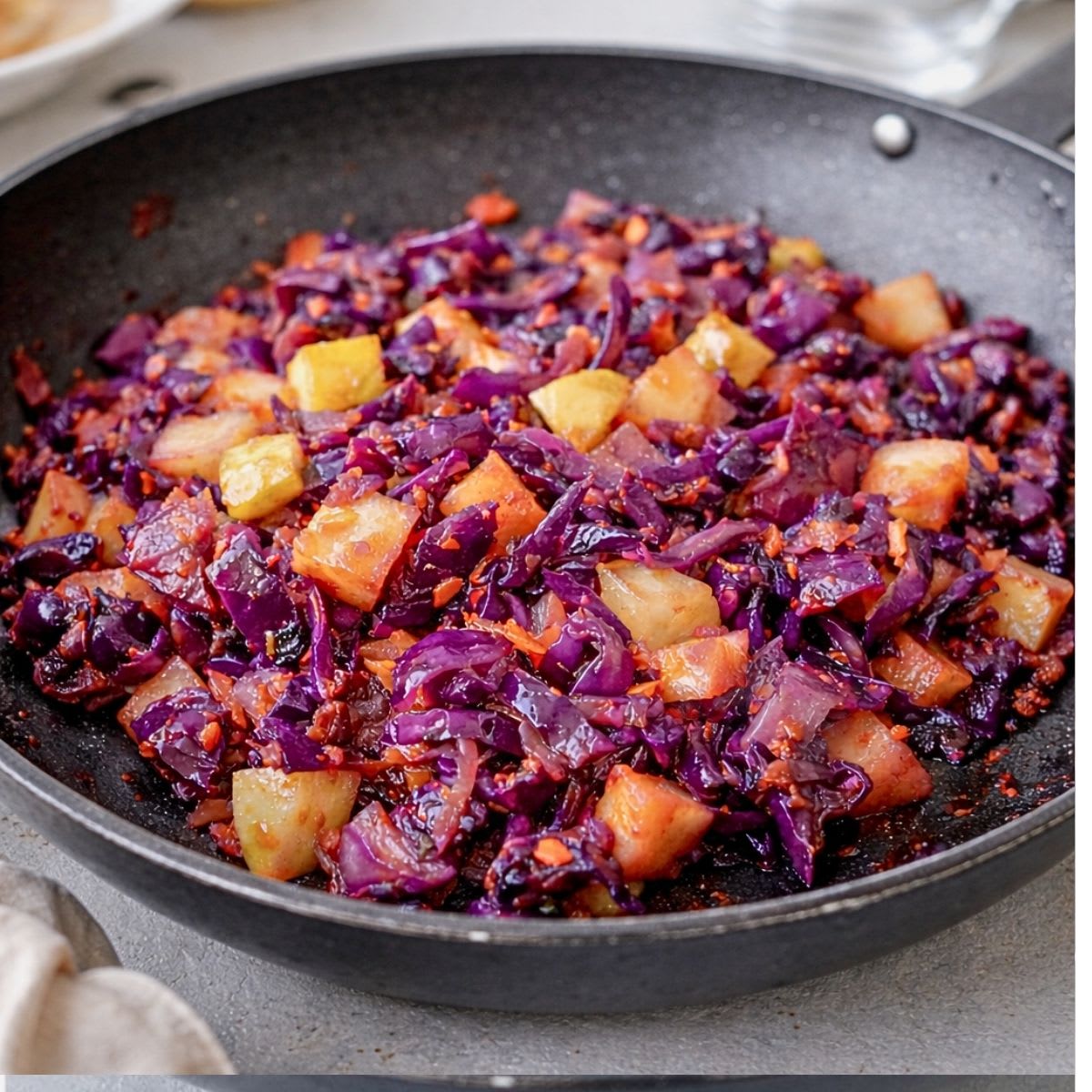 Repolho roxo agridoce refogado com maçã verde: