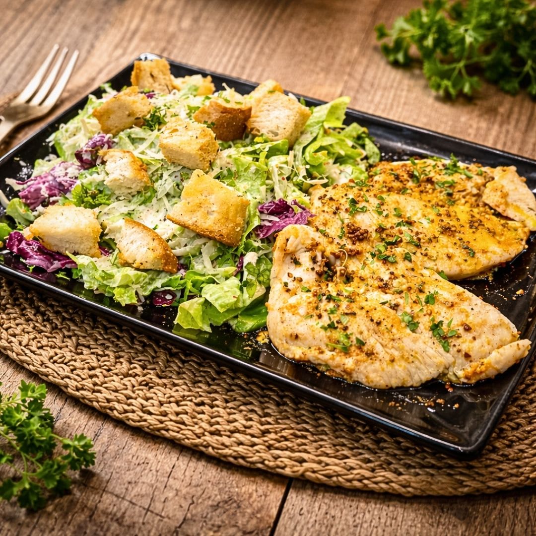 Inspirada na clássica caesar, esta versão leve combina frango grelhado, molho cremoso equilibrado e textura crocante.