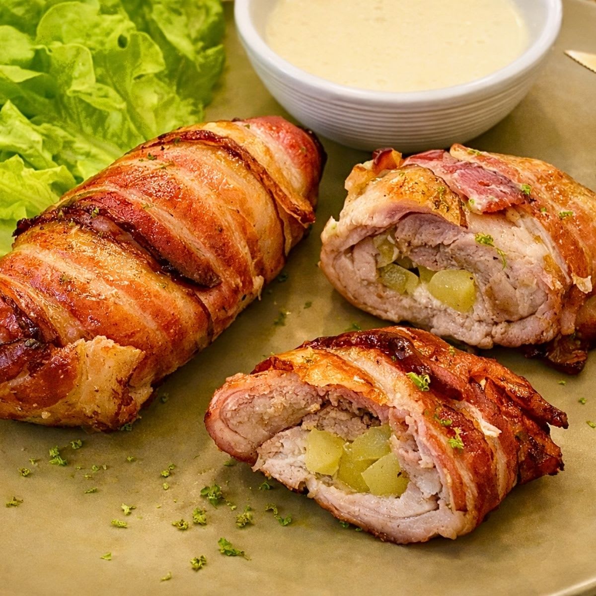 Sobrecoxa recheada com maçã e bacon crocante na airfryer: suculenta, fácil e cheia de sabor.