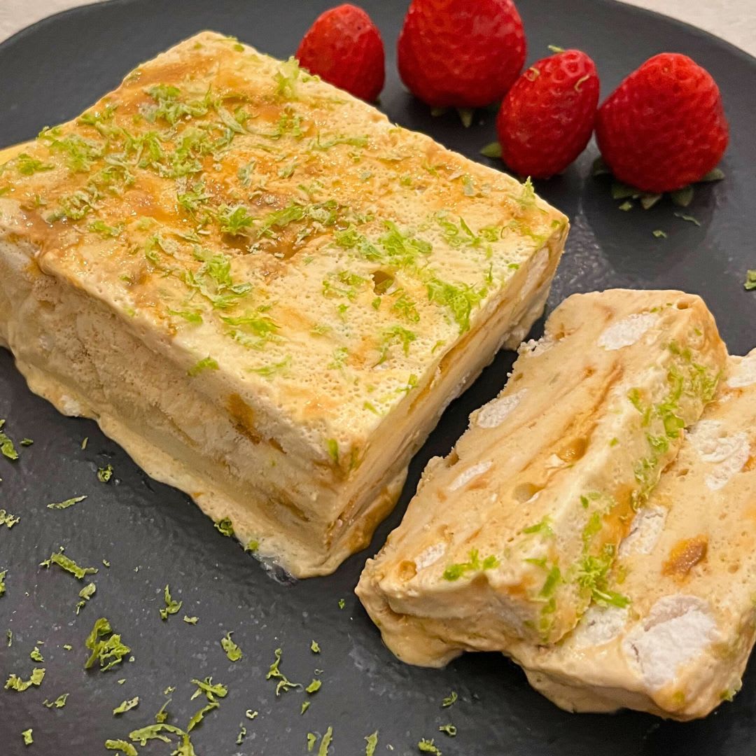 2. Desenforme a Sobremesa Gelada De Doce de Leite com Suspiro Crocante, arrume numa travessa e finalize com as raspas de limão ou laranja (opcional) para um toque cítrico e decorativo.