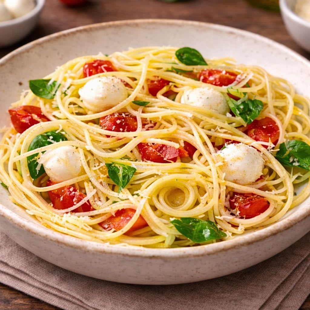 O spaghetti caprese é inspirado na clássica combinação italiana de tomate, muçarela de búfala e manjericão, conhecida pela leveza e frescor. Nesta versão com massa, o contraste entre o spaghetti quente e o molho frio cria uma experiência sofisticada, perfeita para um jantar rápido, leve e cheio de sabor.