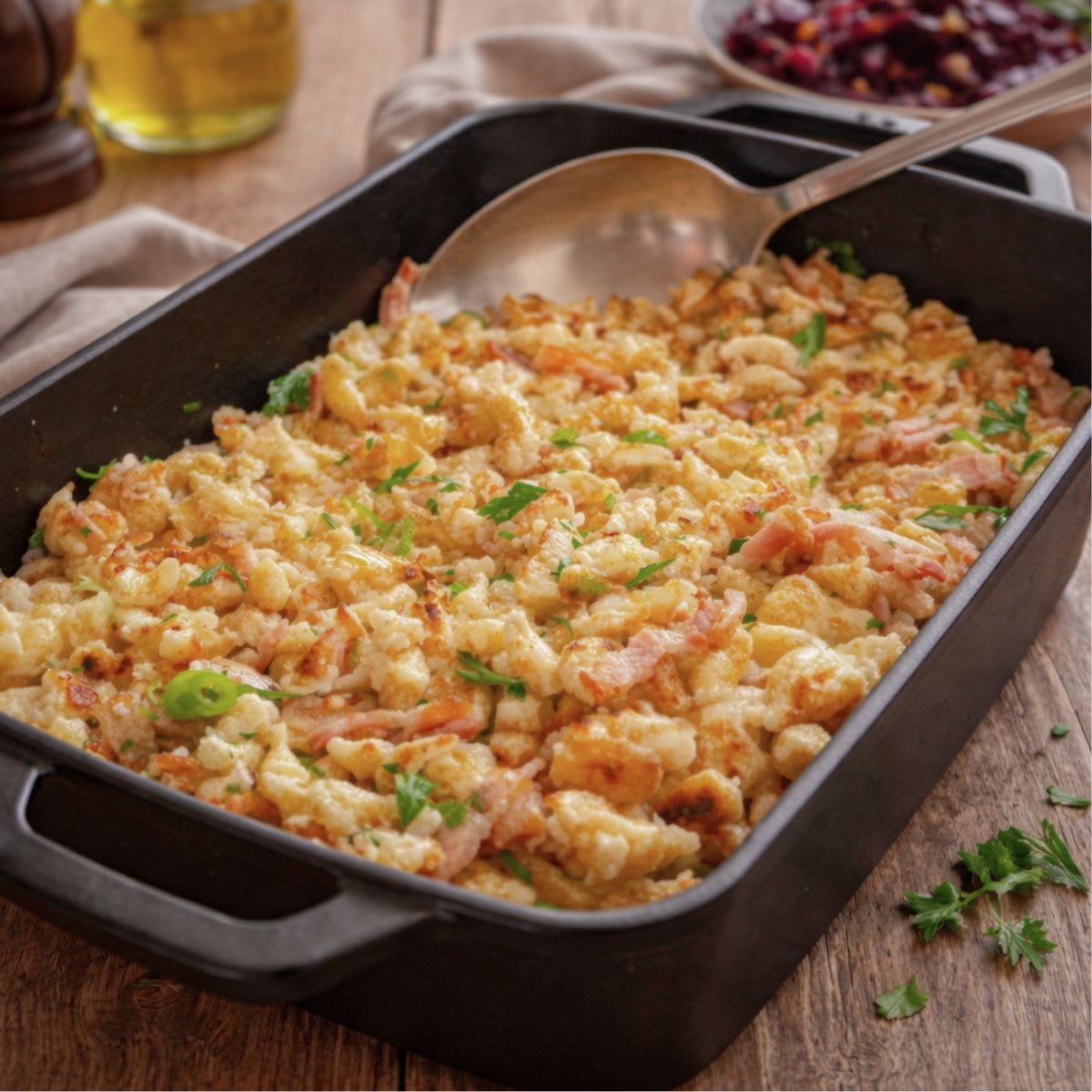 Receita de spatzle alemão fácil sem glúten, leve e macio, dourado na manteiga com bacon crocante.