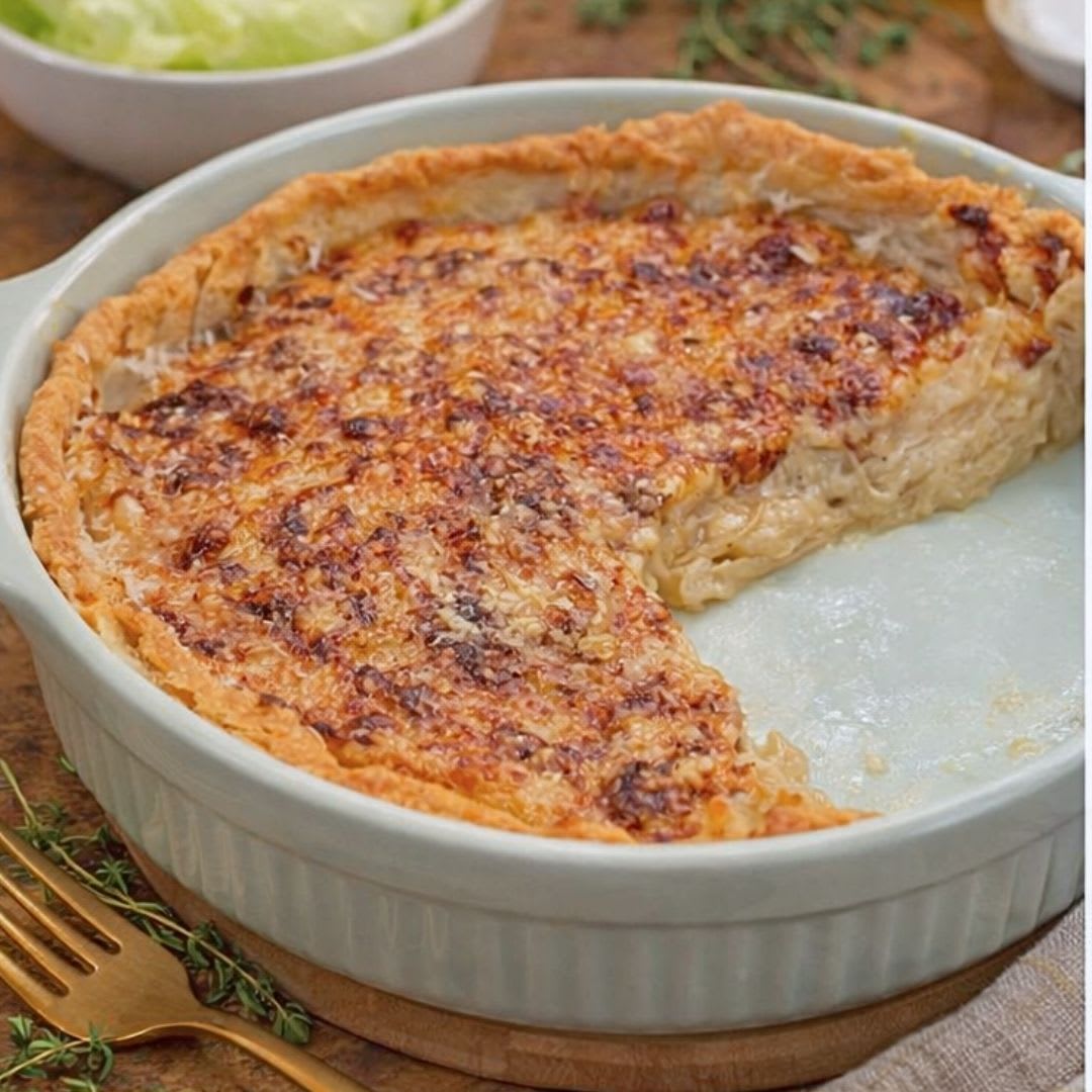 2. Essa torta cremosa é uma versão rústica e adaptada da clássica quiche de cebola caramelizada, mas com textura mais encorpada e gratinada com parmesão.
