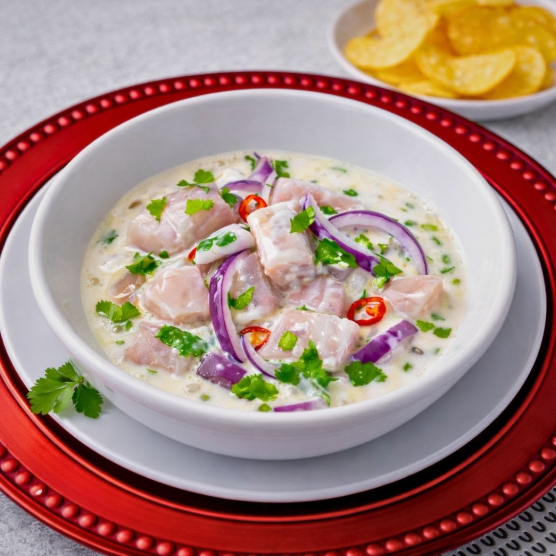 Ceviche de tilápia com marinada cítrica e leite de coco: leve, cremoso e aromático.