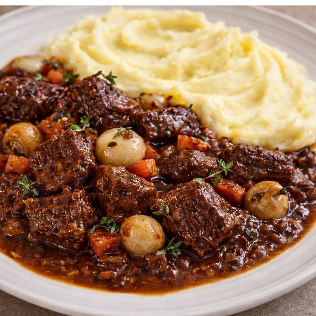 Boeuf bourguignon feito na pressão com vinho, bacon e legumes: rápido, suculento e cheio de sabor.