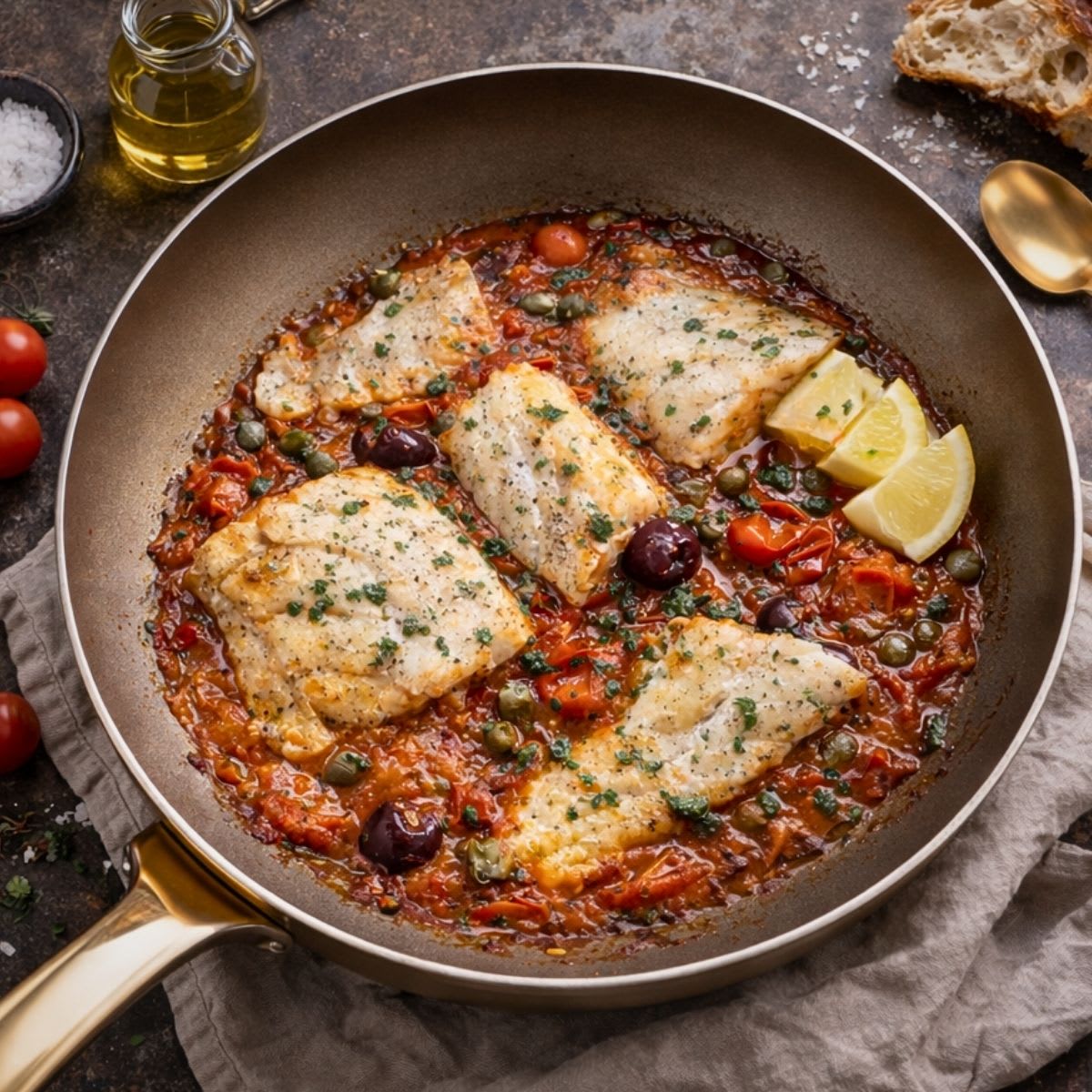 Filé de peixe suculento na panela com molho de tomate, azeitonas e alcaparras. Receita fácil, rápida e cheia de sabor.