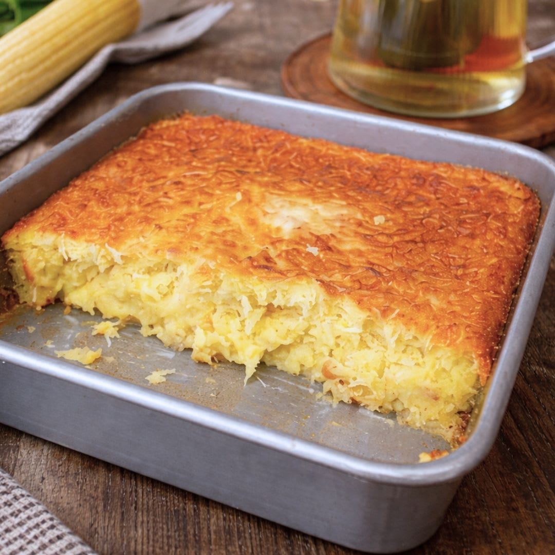 Bolo de milho verde cremoso com coco, sem glúten e sem lactose, feito no liquidificador, com textura de pamonha assada e sabor de cocada