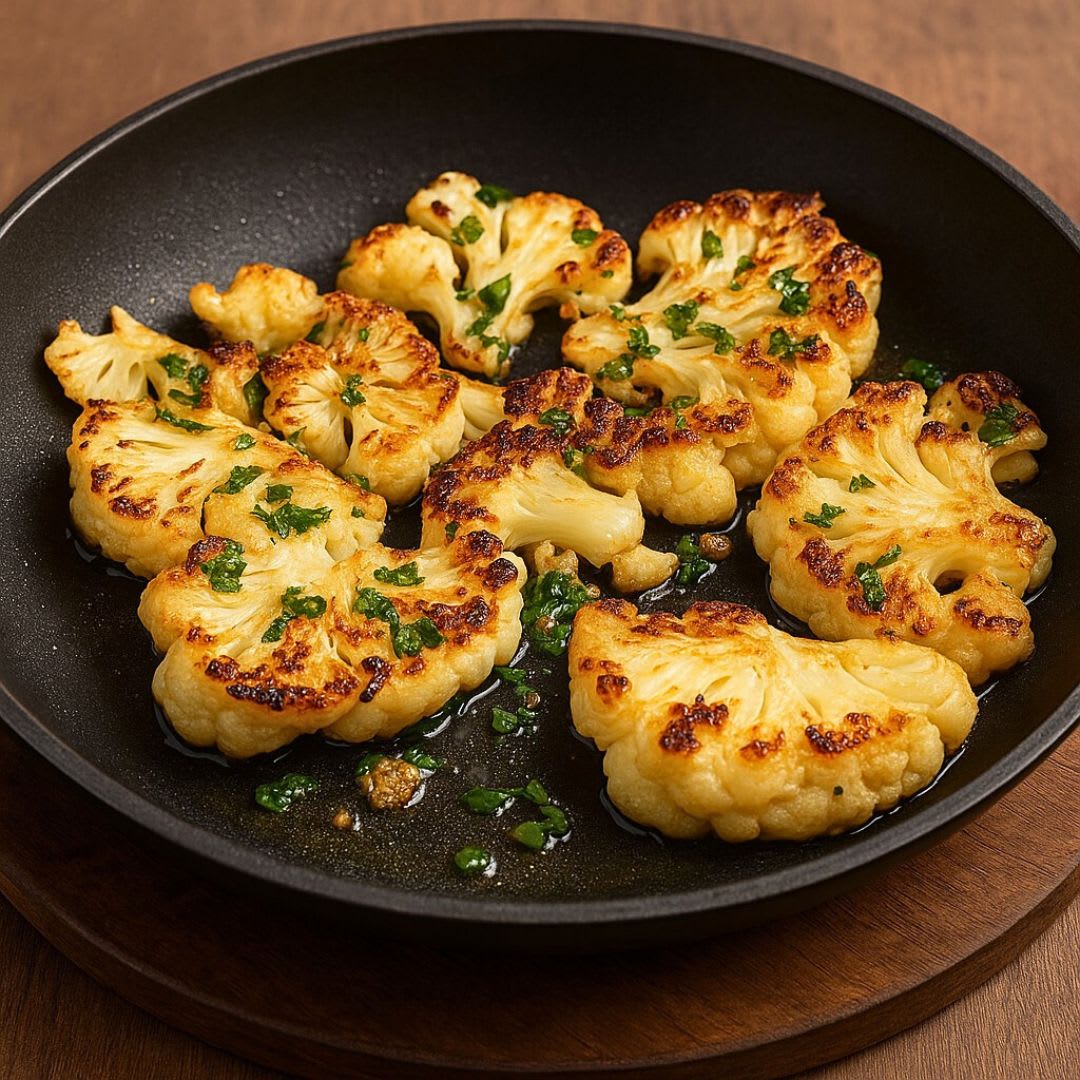 Crocante e dourada, couve-flor no molho de azeite, alho e salsinha na medida certa.